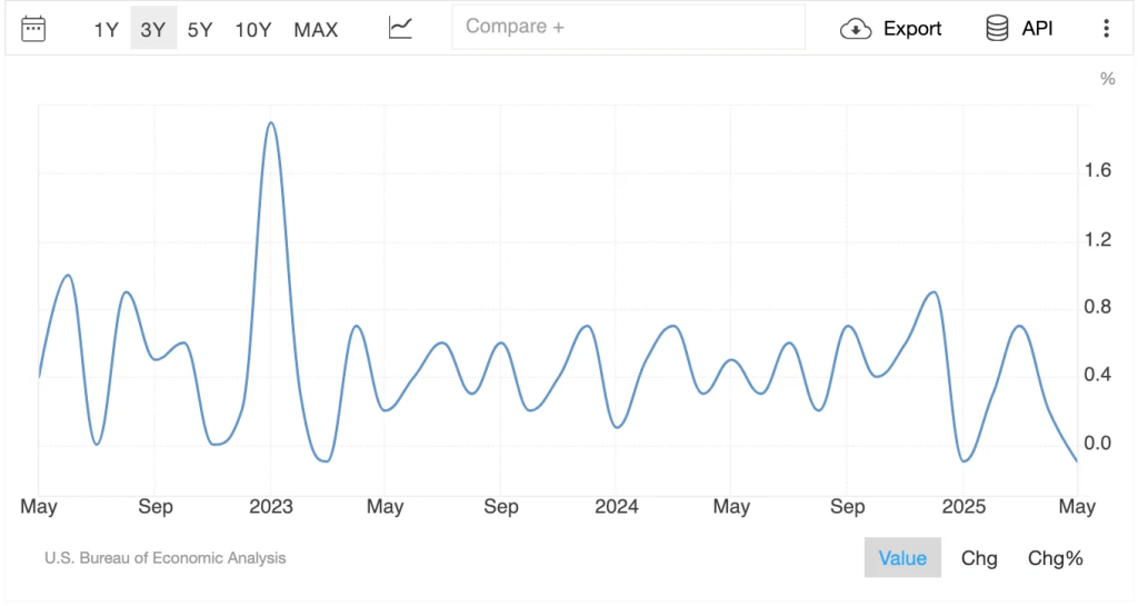 Starting with consumer spending, I wanted to draw attention to three indicators: Volume of auto loans, personal spending, and consumer confidence. All of which are telling the same story, a steady downtrend representing consumers planning to and are spending less. Even more alarming, the volume of auto loans is also steadily decreasing.